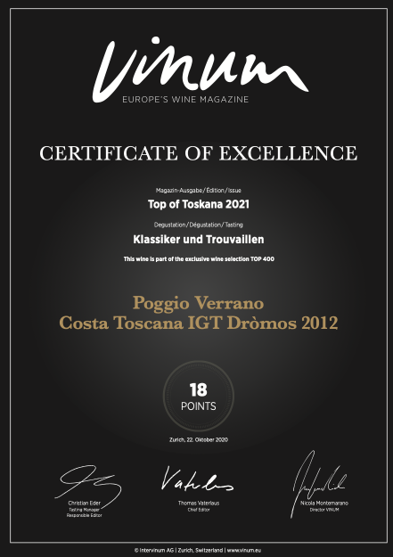 Na jarenlang zijn familie te hebben bijgestaan in Soave (Veneto), werd wijnmaker en eigenaar Francesco Bolla getrokken door het Etruskische landschap van de Toscaanse Maremma. Het Mediterrane klimaat en de koele, ziltige zeebries hebben een bijzonder gunstig effect op de wijngaarden. Strevend naar perfectie, krijgt Francesco waardevolle adviezen van zijn goede vriend Carlo Ferrini, één van de meest gerespecteerde, Italiaanse oenologen die ook voor Barone Ricasoli en Poliziano werkt. De wijnen krijgen al jarenlang hoge beoordeling van onder andere Parker (Wine Advocate). De Poggio Verrano Dromos staat al jaar in-jaar-uit in de top-10 of Toscane lijstje van VINUM in het rijtje met Tignanello en Macchiole Paleo.