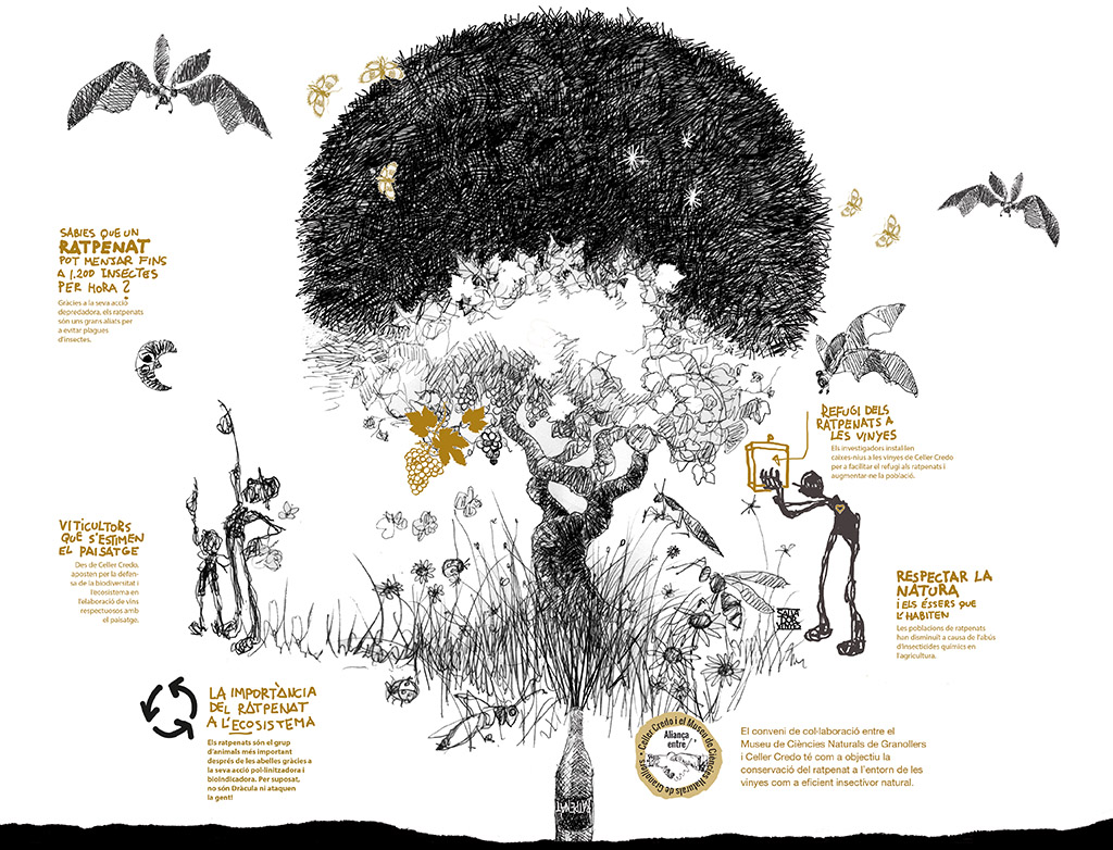 De Vleermuis oftewel de Ratpenat is raadselachtig en onbekend, maar absoluut essentieel voor een uitgebalanceerd ecosysteem. De vleermuis is het enige vliegende zoogdier op aarde. De opmerkelijke biologische kenmerken zijn onder meer de lange levensduur (vleermuizen kunnen meer dan 40 jaar leven) en het vermogen om 600 tot 1.200 insecten per uur te consumeren. De witte wijn Ratpenat (het Catalaanse woord voor "vleermuis") is ontstaan uit een overeenkomst tussen Celler Credo en het Granollers Natural Science Museum om samen te werken om het milieu en de dieren die het bewonen te beschermen. De overeenkomst tussen beide, gestart in 2013, ondersteunt projecten die gericht zijn op het vergroten van het publieke bewustzijn van het belang van vleermuizen in het ecosysteem, waar het een waardevolle rol speelt als efficiënte insecteneter. Celler Credo is onderdeel van Recaredo - de iconische producent fameus om zijn long aged cava's. De stille (biologische) wijnen voert men onder het label Celler Credo