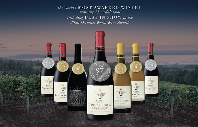 Sinds de eerste jaargang in 1990 heeft Domaine Serene bekroonde wijnen geproduceerd, waaronder Evenstad Reserve Pinot Noir, erkend als 's werelds #3 wijn van 2013 door Wine Spectator Magazine. Bovendien werd de 2012 Winery Hill Vineyard Pinot Noir in 2016 door het tijdschrift Decanter uitgeroepen tot de Top Pinot Noir ter wereld en ontving de Evenstad Reserve Chardonnay 2014 95 punten en werd hij gerangschikt als de # 2 wijn ter wereld in Wine Spectator's Top 100 Wines of het jaar. Dit maakte Domaine Serene de enige wijnmakerij ter wereld die een Top 3-classificatie ontving in Wine Spectator's Top 100 Wines of the Year voor zowel Pinot Noir als Chardonnay. In 2017 werd de Jerusalem Hill Pinot Noir 2013 bekroond met de Top American Pinot Noir tijdens de Decanter World Wine Awards. Door het continue streven naar kwaliteit en innovatie heeft Domaine Serene wereldwijde erkenning gekregen als een iconisch kwaliteitsleider van Pinot Noir en Chardonnay.