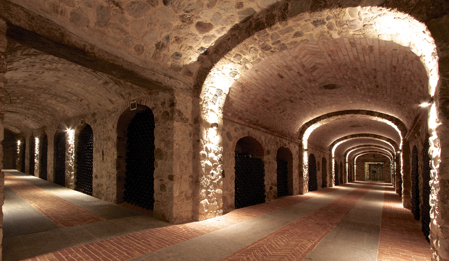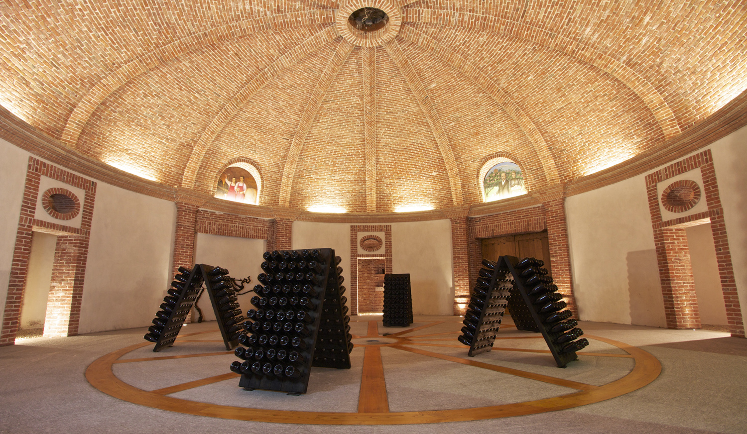 The wine cellar, with an area of about 1800 square meters, has been completely excavated into the hill. The cellar is therefore partly located under the building and extends almost 30 meters under the hill. It is divided into a labyrinth of corridors, alcoves and rooms. Centrally located in the basement is the beautiful Sala della Ruota. It is a huge dodecagonal space with a dome and a large number of arches. The floor consists of an image of the wheel of the Roero, the symbol of the lords who ruled in this region in the Middle Ages and later. Above a number of niches are paintings depicting different generations of the Faccenda family. The stones used to build the cellar come in part from an old farm that once stood on the property. This ensures the old and authentic look of the cellar.