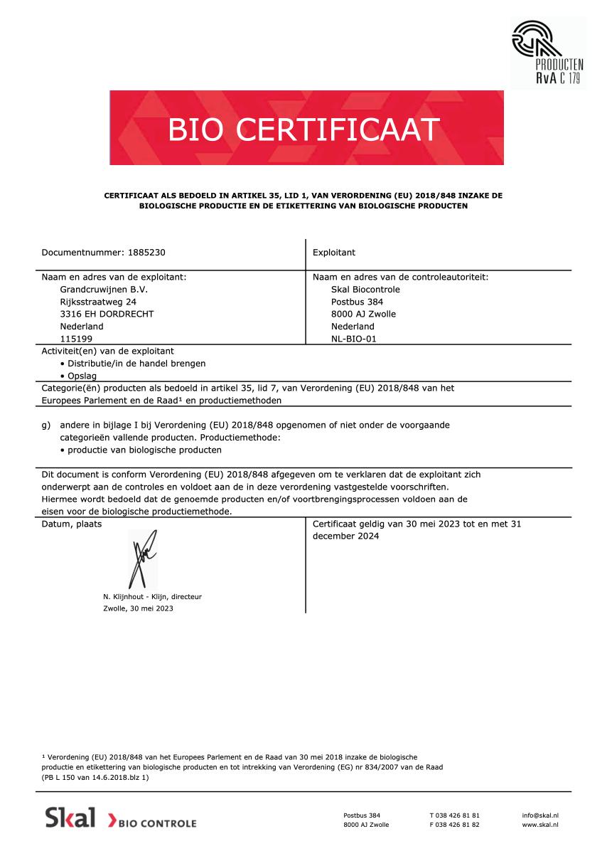 Is Grandcruwijnen gecertificeerd voor SKAL Bio producten