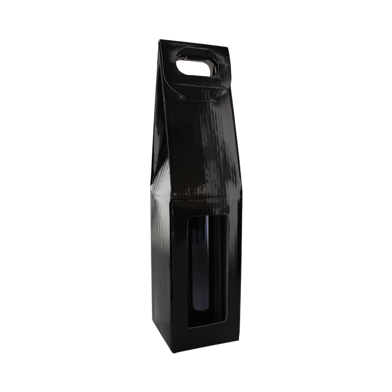 Cadeau verpakking geschikt voor 1 fles. Een kartonnen wijnflestas met handgreep en venster in de kleur zwart.